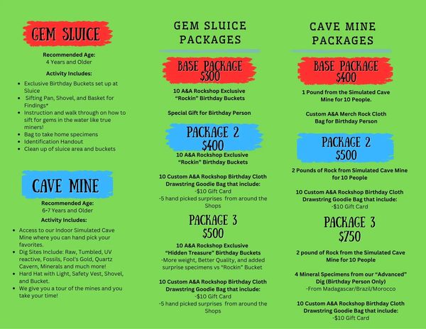 MAKE IT A BIRTHDAY TO REMEMBER AS YOU AND YOUR GUEST DIG FOR TREASURE IN AUTHENTIC MINING GEAR. ALL CAVE MINE PACKAGES ARE PRICED AT, AND INCLUDE, 10 PARTICIPANTS.